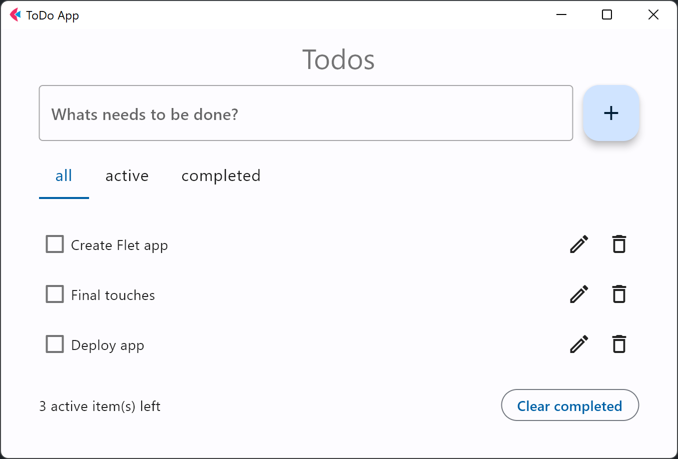 We chose a To-Do app for the tutorial, because it covers all of the basic concepts you would need to create a Flet app: building a page layout, adding controls, handling events, displaying and editing lists, making reusable UI components, and publishing options.